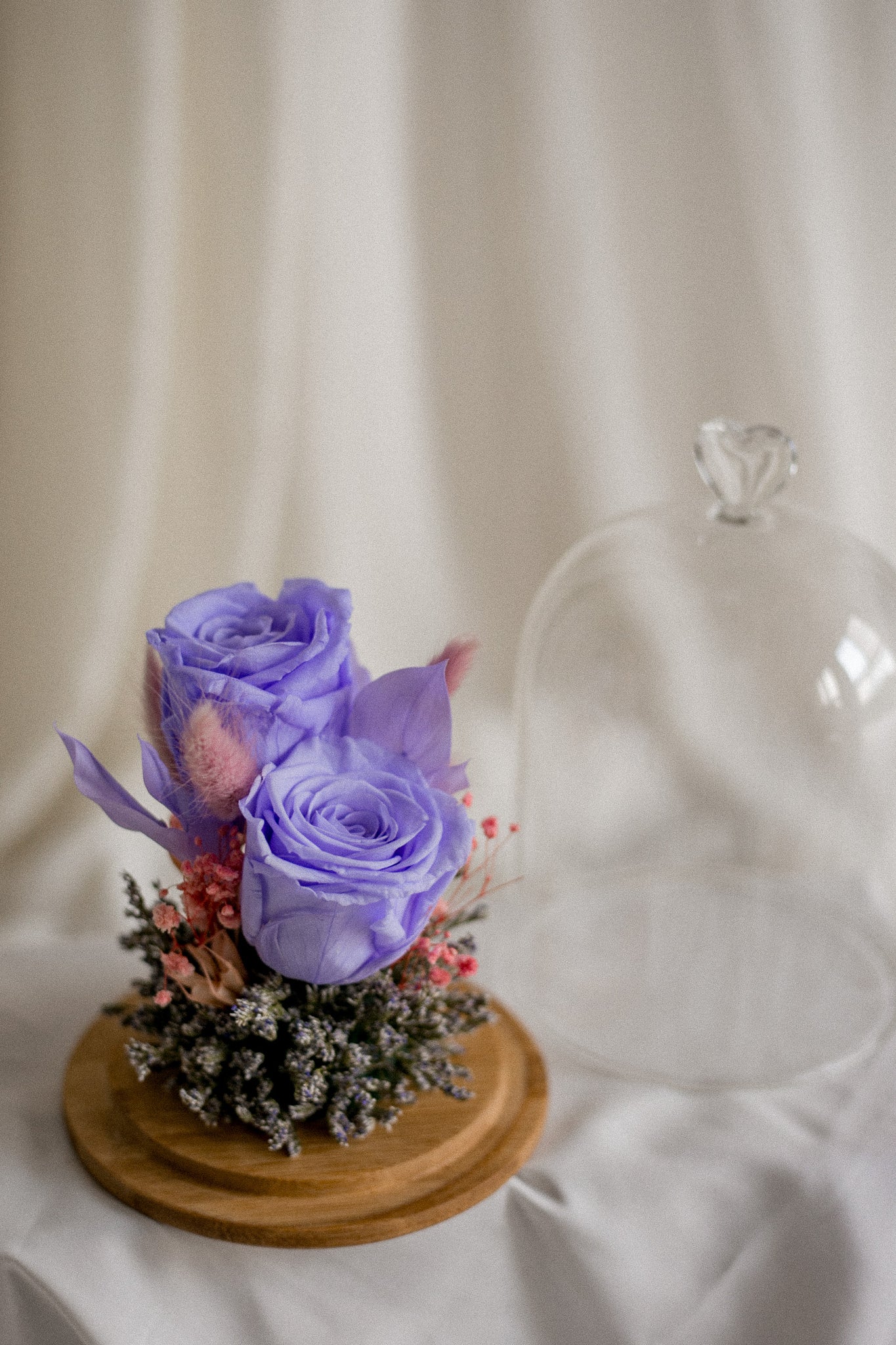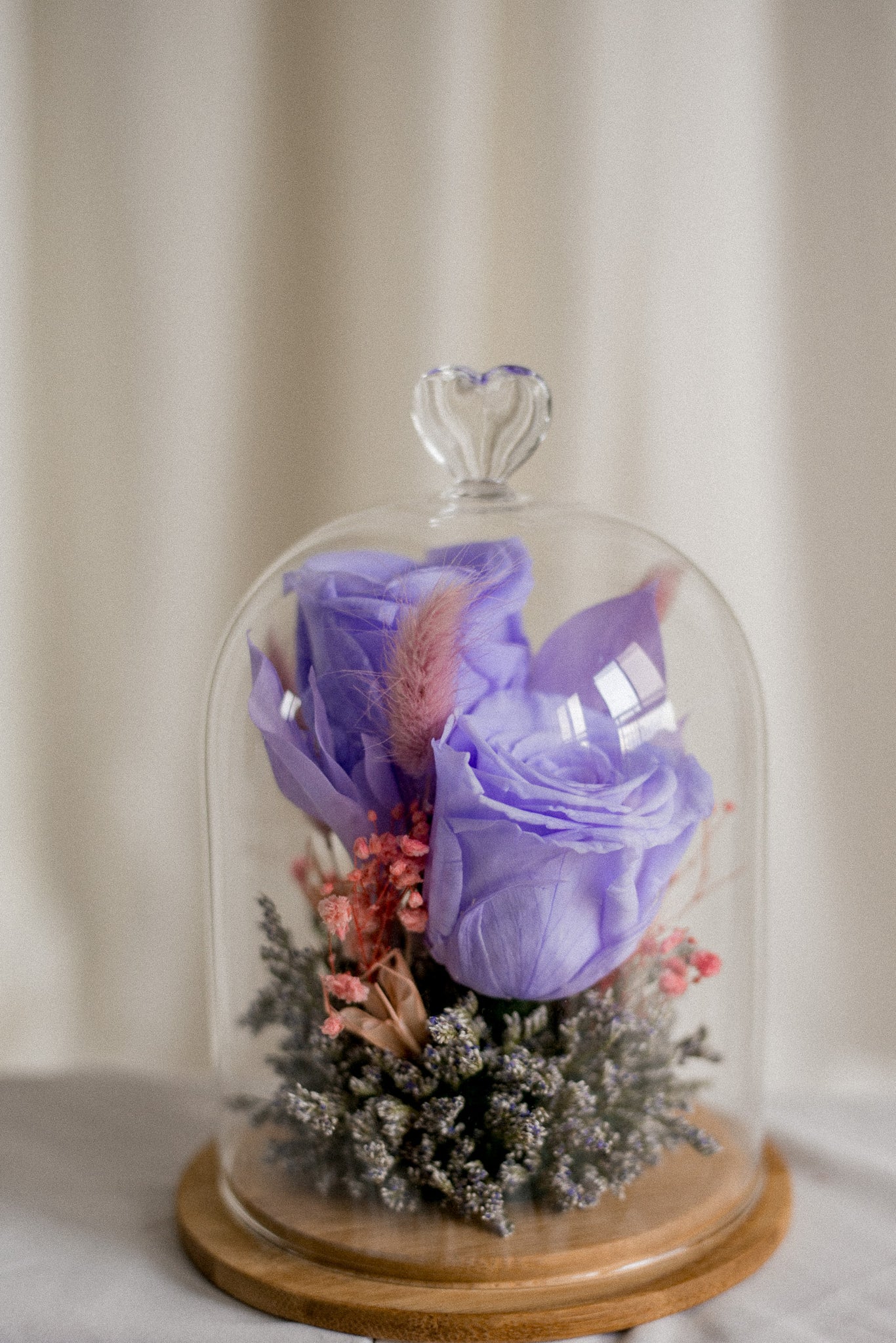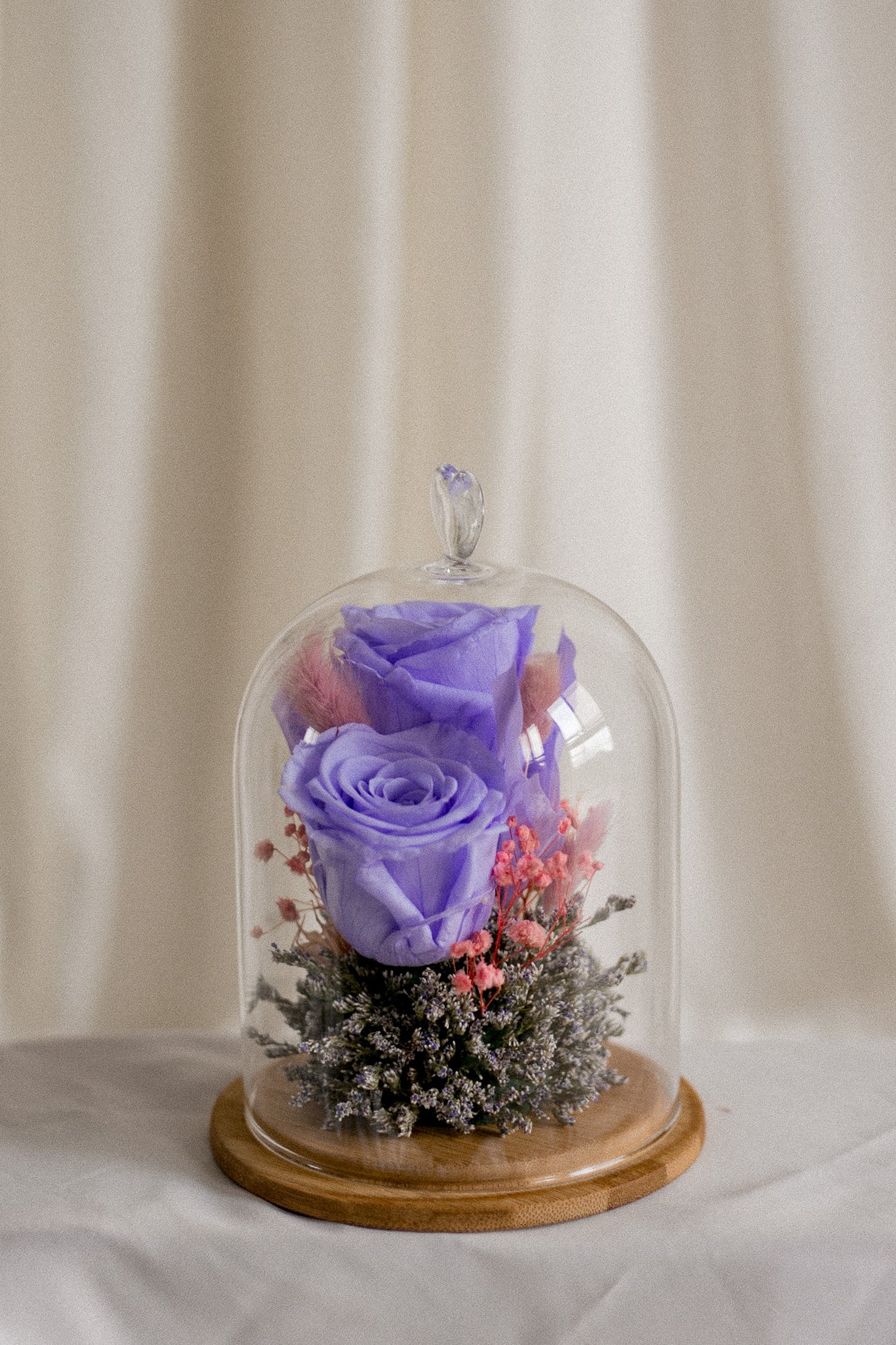 A dreamy purple dome arrangement featuring 2 preserved roses as the main blooms, surrounded by delicate filler flowers. Inspired by the beauty of togetherness, this handcrafted arrangement celebrates love, connection, and timeless elegance — perfect for gifting or keeping as a cherished keepsake.